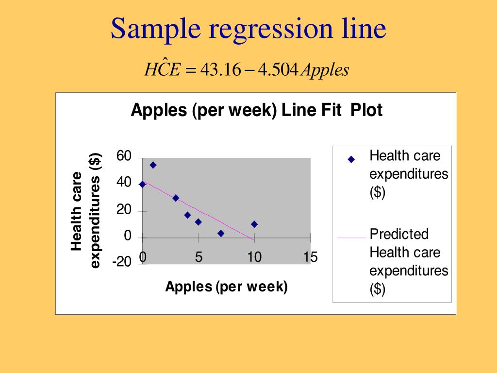 The effect of X on Y (from regressing “Y on X”) Interpretation of OLS Parameters • Sample regression function is • For one-unit change in X, the average value of Y changes by units • intercept ?