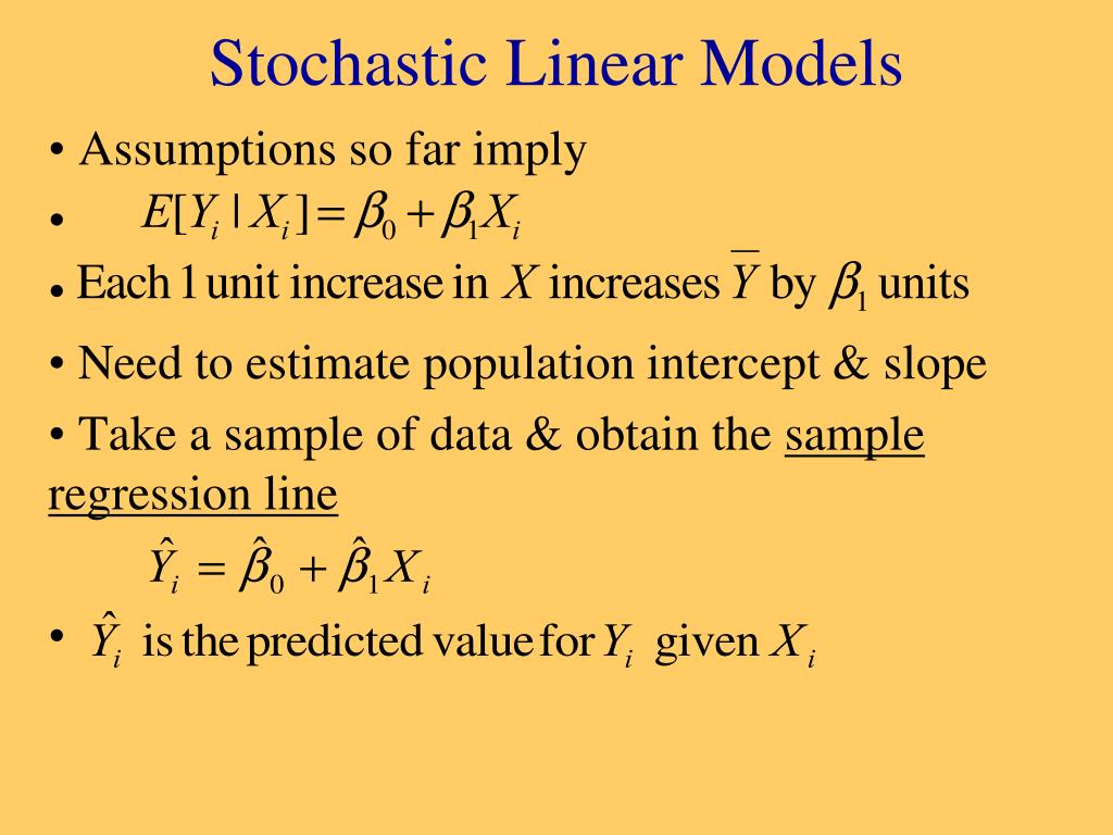 Stochastic Linear Models Assumptions so far imply Need to estimate population intercept & slope Take a sample of data & obtain the sample regression line