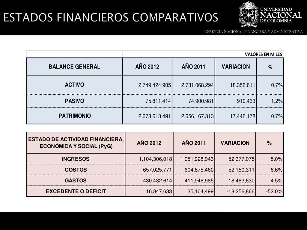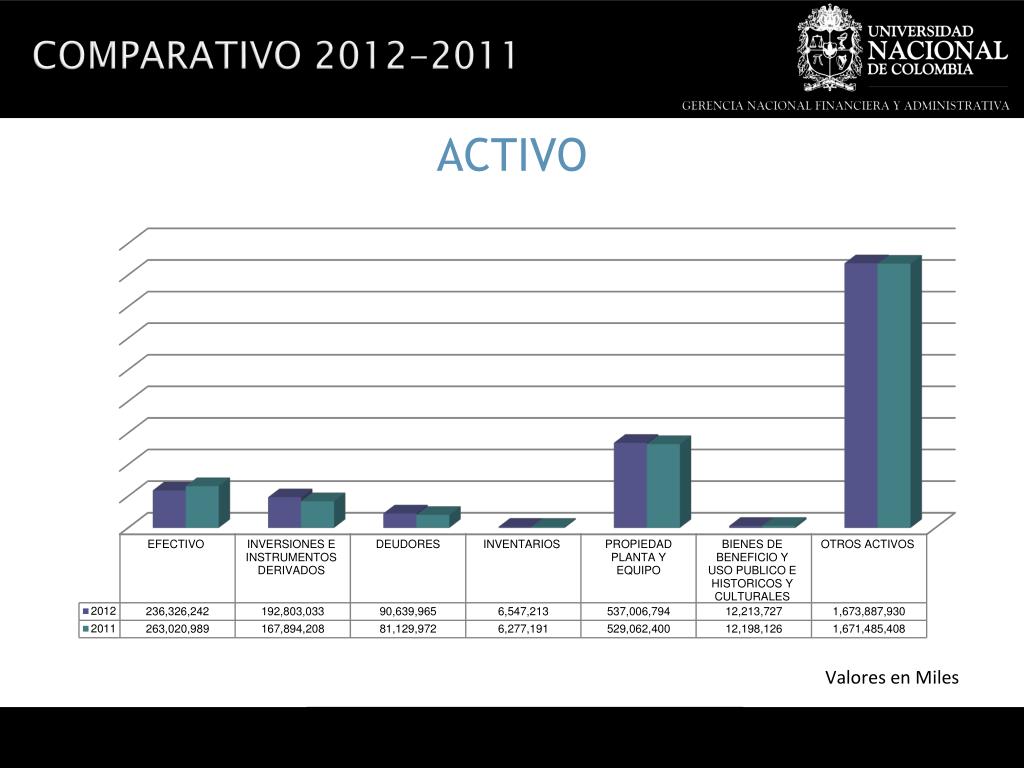 ESTADOS CONTABLES COMPARATIVOS 2012-2011. CONSEJO SUPERIOR UNIVERSITARIO. ESTADOS FINANCIEROS COMPARATIVOS . ACTIVO. COMPARATIVO 2012-2011. PASIVO. COMPARATIVO 2012-2011. Valores en miles. COMPARATIVO 2012-2011. PATRIMONIO. Valores en miles. COMPARATIVO 2012-2011. INGRESOS.