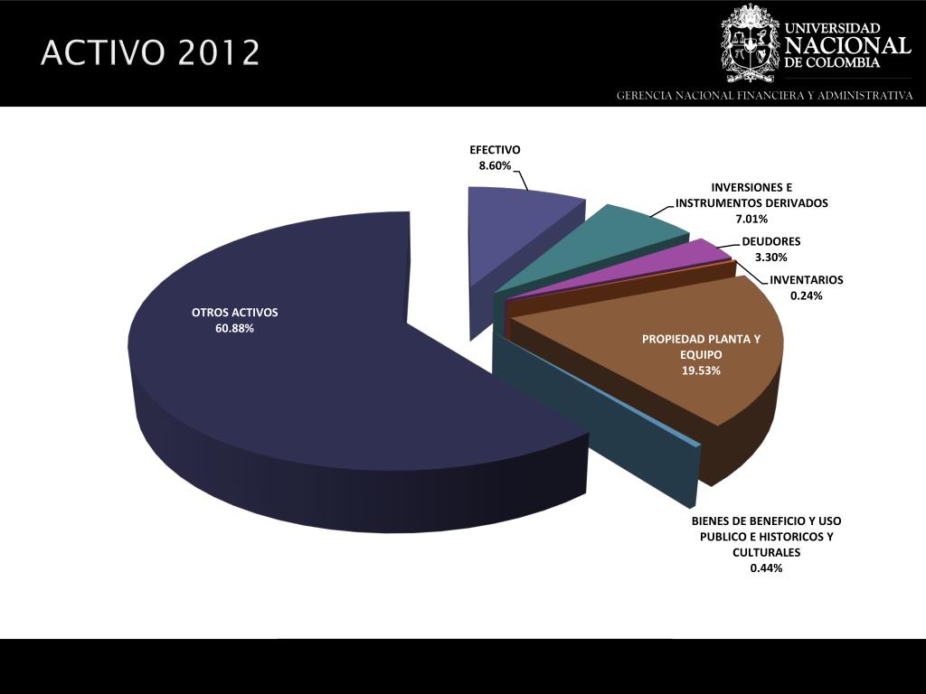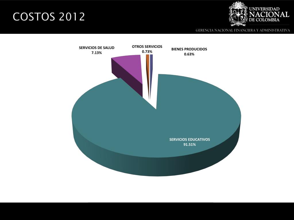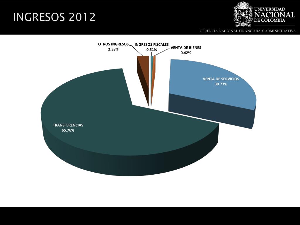 INGRESOS 2012 –2011 SERVICIOS EDUCATIVOS Valores en miles • Servicios Educativos: Refleja el valor de los ingresos por conceptos de pregrado y posgrado (Inscripciones y matriculas, Derechos Académicos, Derechos de grado, Sistematización entre otros); por investigación y desarrollo tecnológico; Educación no formal – Extensión (Consultorías, Asesorías, Interventoría, Educación continuada entre otros); y servicios conexos a la educación. • * Durante la vigencia 2012 se reclasificaron conceptos de servicios conexos a ingresos de educación formal profesional y posgrados.