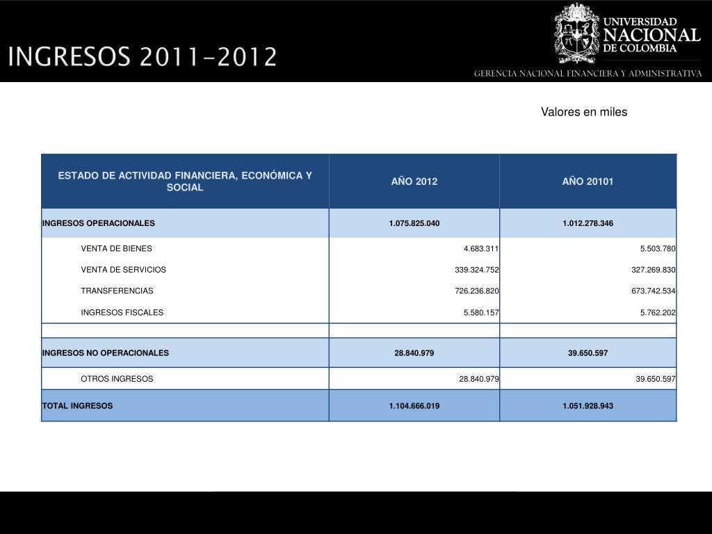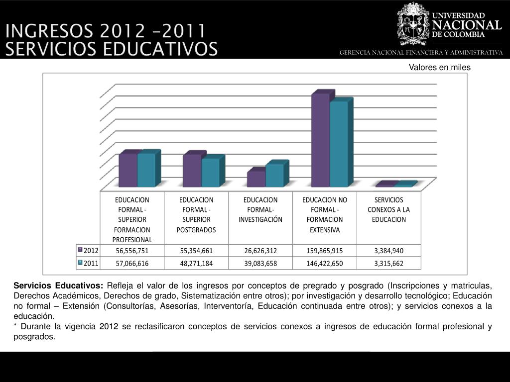INGRESOS 2012 – 2011 VENTA DE SERVICIOS miles Valores en miles VENTA DE SERVICIOS: Refleja el valor de los ingresos por la venta de servicios educativos (pregrado y posgrado, investigación, extensión y servicios conexos) en el marco de la actividad misional de la Universidad; los ingresos por conceptos de salud; y los servicios de comunicaciones. Incluye las devoluciones y descuentos por los servicios prestados.