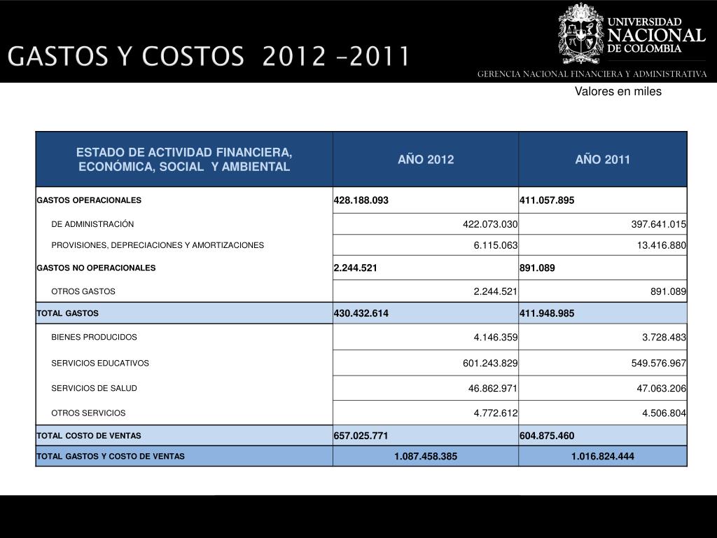 GASTOS Y COSTOS 2012 –2011 Valores en miles