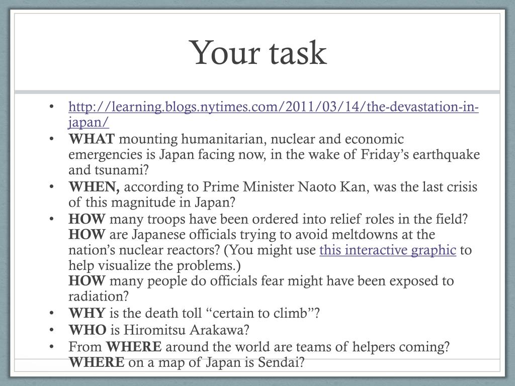 Your task • http://learning.blogs.nytimes.com/2011/03/14/the-devastation-in-japan/ • WHAT mounting humanitarian, nuclear and economic emergencies is Japan facing now, in the wake of Friday’s earthquake and tsunami? • WHEN, according to Prime Minister Naoto Kan, was the last crisis of this magnitude in Japan? • HOW many troops have been ordered into relief roles in the field?HOW are Japanese officials trying to avoid meltdowns at the nation’s nuclear reactors? (You might use this interactive graphic to help visualize the problems.)HOW many people do officials fear might have been exposed to radiation? • WHY is the death toll “certain to climb”? • WHO is Hiromitsu Arakawa? • From WHERE around the world are teams of helpers coming?WHERE on a map of Japan is Sendai?