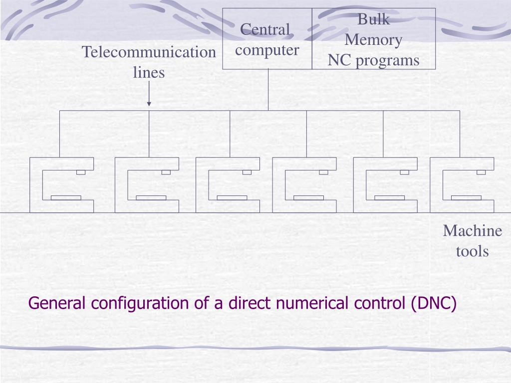 Central computer Bulk Memory NC programs Telecommunication lines General configuration of a direct numerical control (DNC) Machine tools
