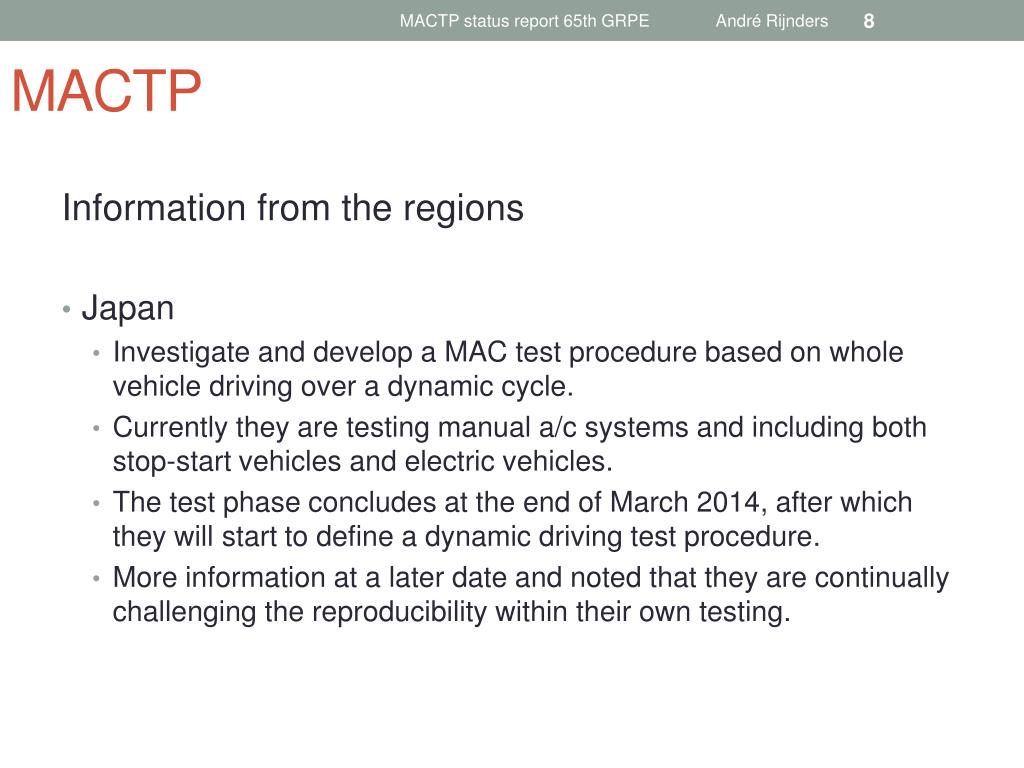 MACTP status report 65th GRPE André Rijnders MACTP Information from the regions • Japan • Investigate and develop a MAC test procedure based on whole vehicle driving over a dynamic cycle. • Currently they are testing manual a/c systems and including both stop-start vehicles and electric vehicles. • The test phase concludes at the end of March 2014, after which they will start to define a dynamic driving test procedure. • More information at a later date and noted that they are continually challenging the reproducibility within their own testing.