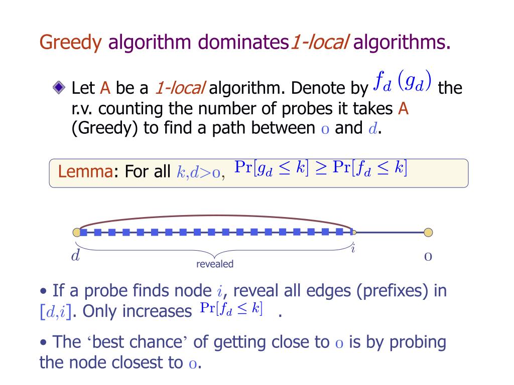 [ ] f k P · r d [ ] [ ] k f k P P · ¸ · r g r d d ( ) f g d d Lemma: For all k;d>0 ; Greedy algorithm dominates1-local algorithms. • Let A be a 1-local algorithm. Denote by the r.v. counting the number of probes it takes A (Greedy) to find a path between 0 and d. i d 0 revealed • If a probe finds node i, reveal all edges (prefixes) in [d;i]. Only increases . • The ‘best chance’ of getting close to 0 is by probing the node closest to 0.