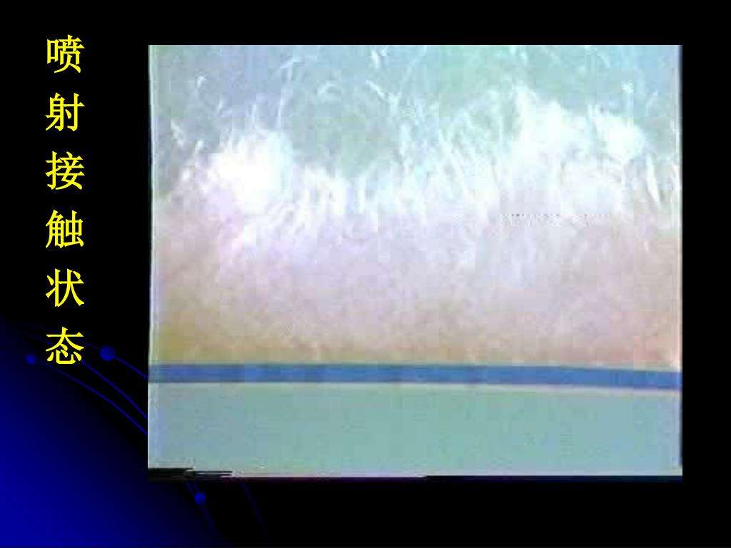 3、喷射接触状态 当气速继续增加,由于气体动能很大,把板上的液体向上喷成大小不等的液滴,直径较大的液滴受重力作用又落回到板上,直径较小的液滴被气体带走,形成液沫夹带。由于液滴回到塔板上又被分散,这种液滴的反复形成和聚集,使传质面积大大增加,而且表面不断更新,有利于传质与传热进行,也是一种较好的接触状态。