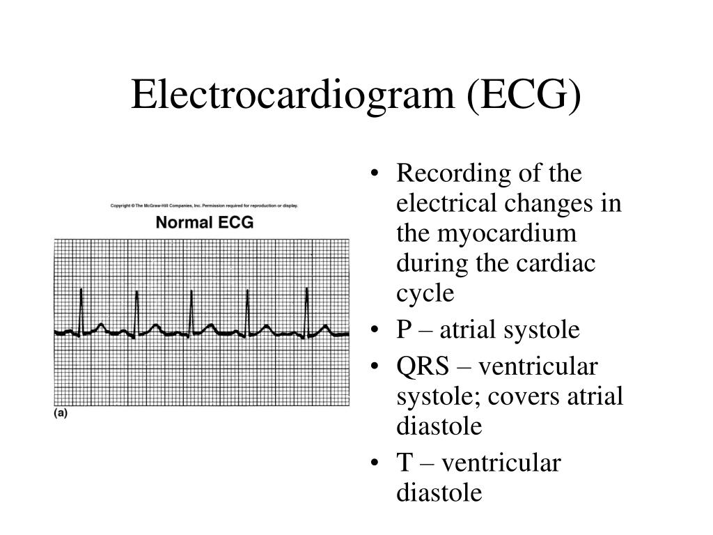 Electrocardiogram (ECG) • Recording of the electrical changes in the myocardium during the cardiac cycle • P – atrial systole • QRS – ventricular systole; covers atrial diastole • T – ventricular diastole