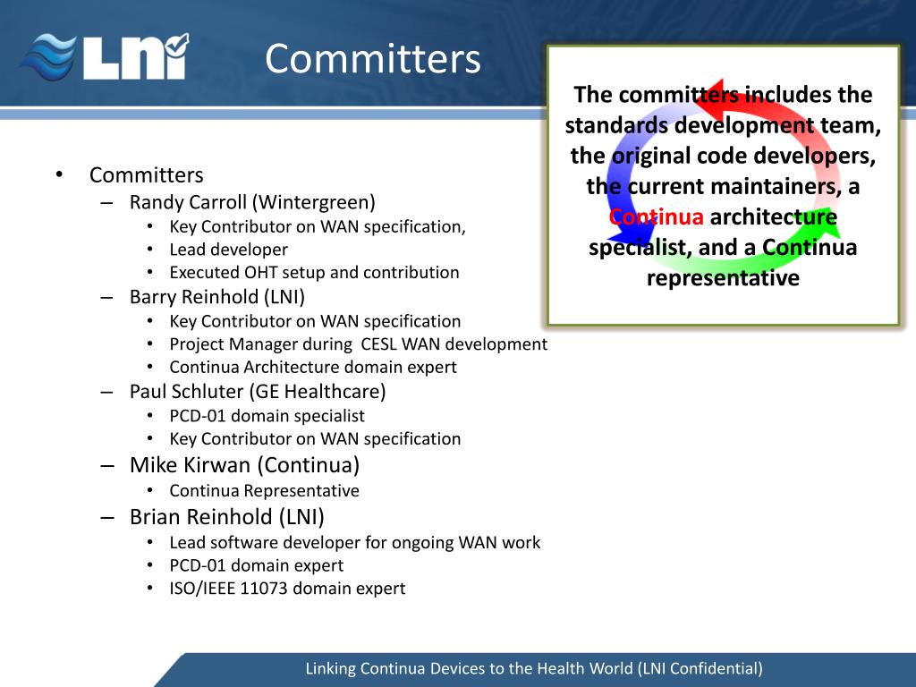 Committers The committers includes the standards development team, the original code developers, the current maintainers, a Continua architecture specialist, and a Continua representative • Committers • Randy Carroll (Wintergreen) • Key Contributor on WAN specification, • Lead developer • Executed OHT setup and contribution • Barry Reinhold (LNI) • Key Contributor on WAN specification • Project Manager during CESL WAN development • Continua Architecture domain expert • Paul Schluter (GE Healthcare) • PCD-01 domain specialist • Key Contributor on WAN specification • Mike Kirwan (Continua) • Continua Representative • Brian Reinhold (LNI) • Lead software developer for ongoing WAN work • PCD-01 domain expert • ISO/IEEE 11073 domain expert