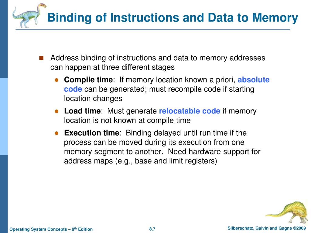 Binding of Instructions and Data to Memory • Address binding of instructions and data to memory addresses can happen at three different stages • Compile time: If memory location known a priori, absolute codecan be generated; must recompile code if starting location changes • Load time: Must generate relocatable code if memory location is not known at compile time • Execution time: Binding delayed until run time if the process can be moved during its execution from one memory segment to another. Need hardware support for address maps (e.g., base and limitregisters)
