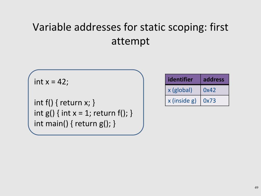 Variable addresses for static scoping: first attempt intx = 42; intf() { return x; } intg() { int x = 1; return f(); } int main() { return g(); }
