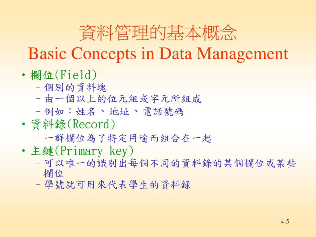 資料管理的基本概念 Basic Concepts in Data Management • 欄位(Field) • 個別的資料塊 • 由一個以上的位元組或字元所組成 • 例如:姓名、地址、電話號碼 • 資料錄(Record) • 一群欄位為了特定用途而組合在一起 • 主鍵(Primary key) • 可以唯一的識別出每個不同的資料錄的某個欄位或某些欄位 • 學號就可用來代表學生的資料錄