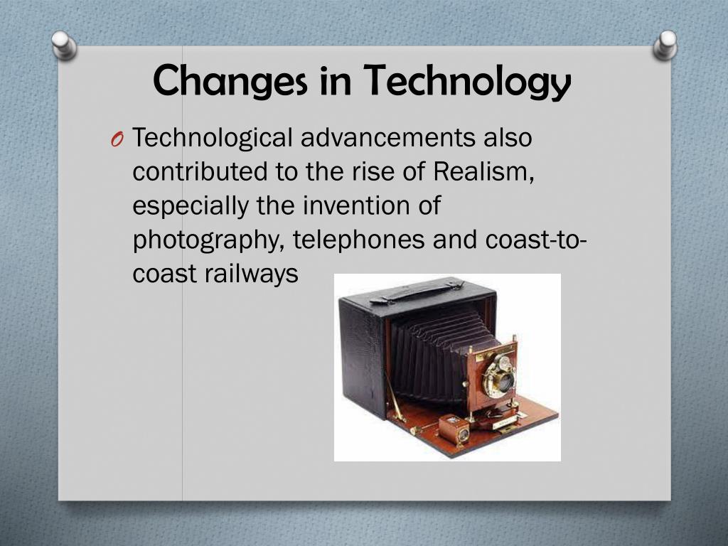 Changes in Technology • Technological advancements also contributed to the rise of Realism, especially the invention of photography, telephones and coast-to-coast railways