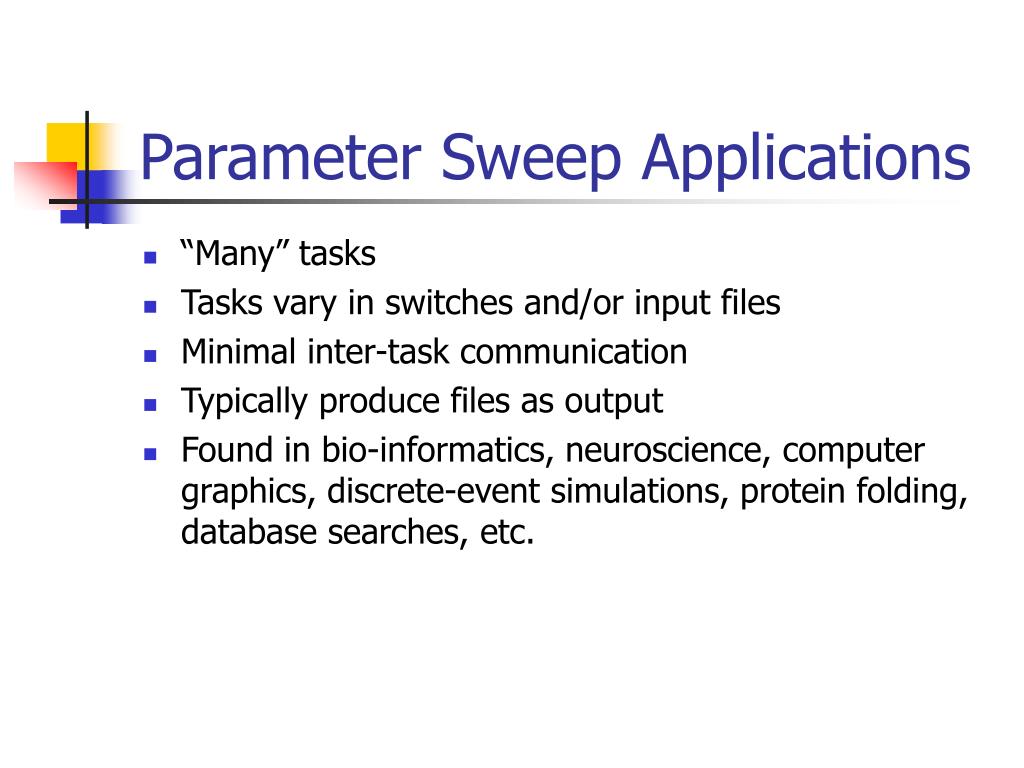 Parameter Sweep Applications • “Many” tasks • Tasks vary in switches and/or input files • Minimal inter-task communication • Typically produce files as output • Found in bio-informatics, neuroscience, computer graphics, discrete-event simulations, protein folding, database searches, etc.