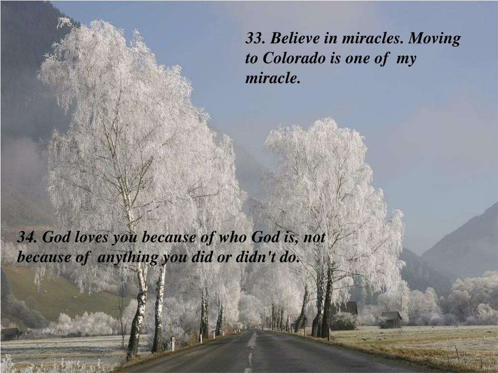33. Believe in miracles. Moving to Colorado is one of my miracle. 34. God loves you because of who God is, not because of anything you did or didn't do.