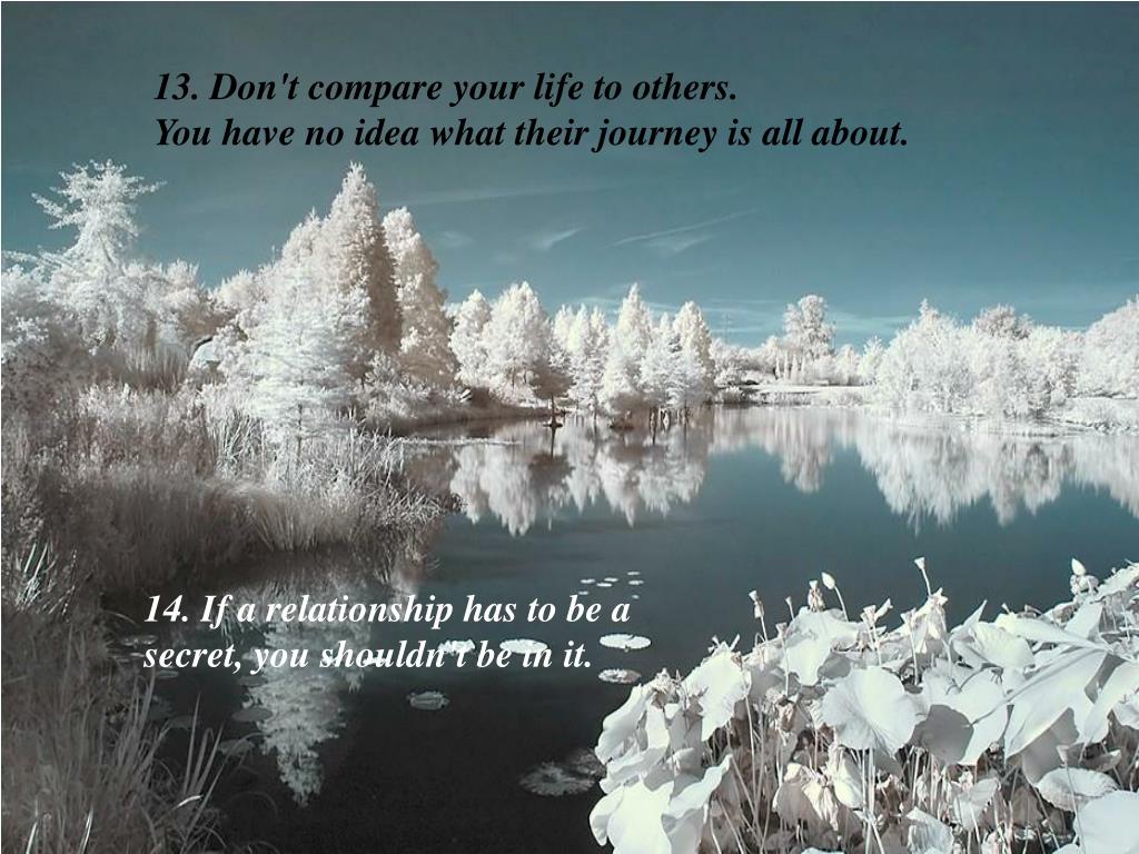 13. Don't compare your life to others. You have no idea what their journey is all about. 14. If a relationship has to be a secret, you shouldn't be in it.