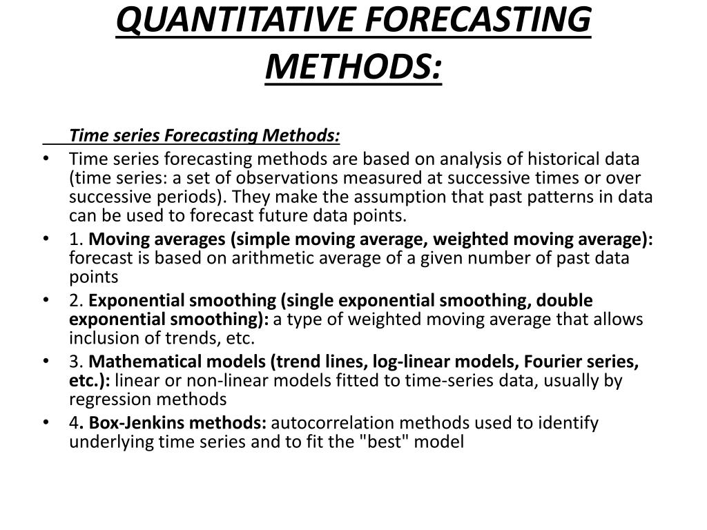 QUANTITATIVE FORECASTING METHODS: Time series Forecasting Methods: • Time series forecasting methods are based on analysis of historical data (time series: a set of observations measured at successive times or over successive periods). They make the assumption that past patterns in data can be used to forecast future data points. • 1. Moving averages (simple moving average, weighted moving average): forecast is based on arithmetic average of a given number of past data points • 2. Exponential smoothing (single exponential smoothing, double exponential smoothing): a type of weighted moving average that allows inclusion of trends, etc. • 3. Mathematical models (trend lines, log-linear models, Fourier series, etc.): linear or non-linear models fitted to time-series data, usually by regression methods • 4. Box-Jenkins methods: autocorrelation methods used to identify underlying time series and to fit the "best" model