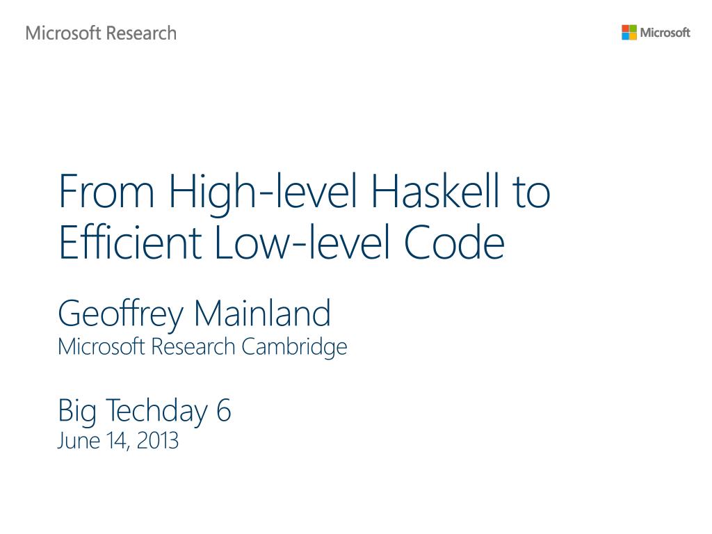 From High-level Haskell to Efficient Low-level Code Geoffrey Mainland Microsoft Research Cambridge Big Techday 6 June 14, 2013