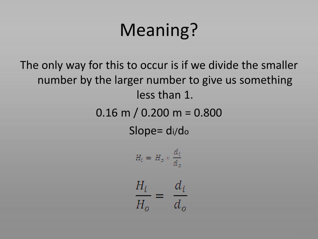 Meaning? The only way for this to occur is if we divide the smaller number by the larger number to give us something less than 1. 0.16 m / 0.200 m = 0.800 Slope= di/do