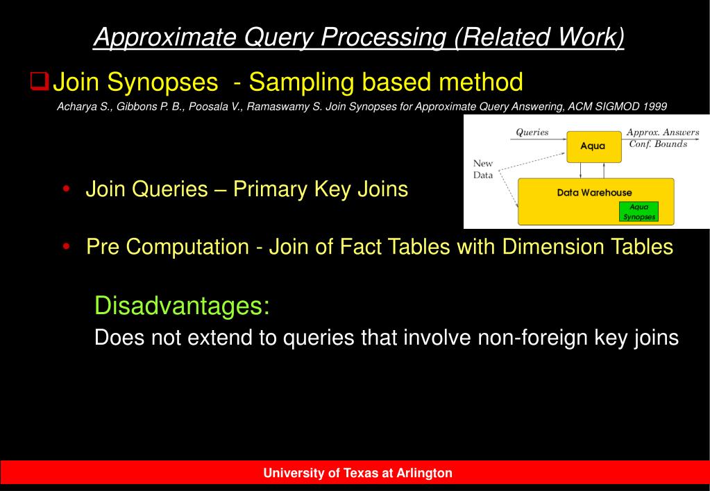 Approximate Query Processing (Related Work) • Join Synopses - Sampling based method • Acharya S., Gibbons P. B., Poosala V., Ramaswamy S. Join Synopses for Approximate Query Answering, ACM SIGMOD 1999 • Join Queries – Primary Key Joins • Pre Computation - Join of Fact Tables with Dimension Tables • Disadvantages: • Does not extend to queries that involve non-foreign key joins