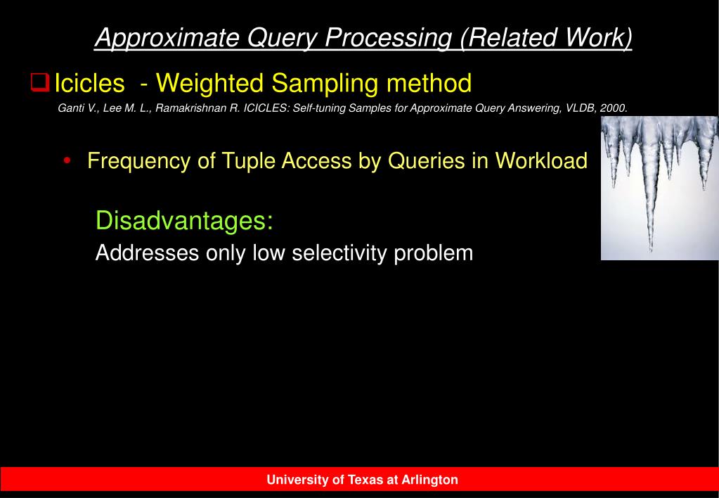 Approximate Query Processing (Related Work) • Icicles - Weighted Sampling method • Ganti V., Lee M. L., Ramakrishnan R. ICICLES: Self-tuning Samples for Approximate Query Answering, VLDB, 2000. • Frequency of Tuple Access by Queries in Workload • Disadvantages: • Addresses only low selectivity problem