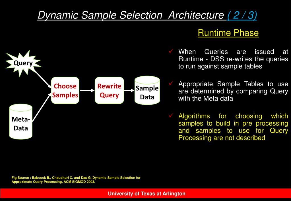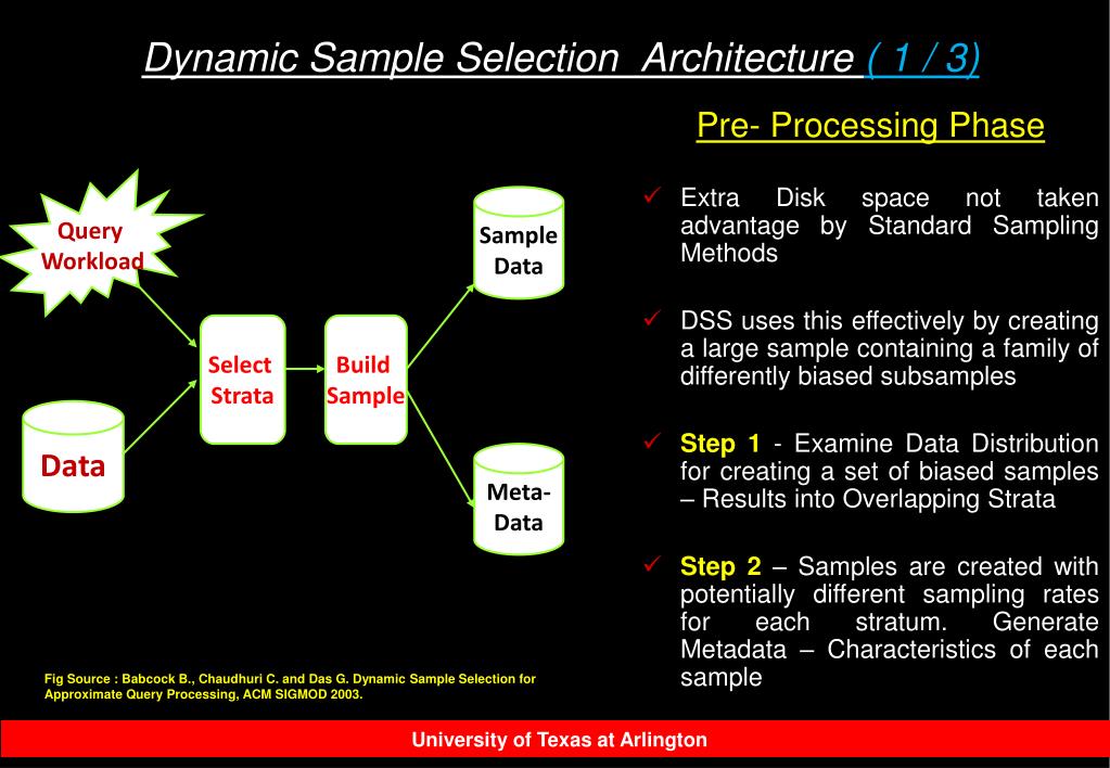 Dynamic Sample Selection Architecture ( 1 / 3) • Pre- Processing Phase • Extra Disk space not taken advantage by Standard Sampling Methods • DSS uses this effectively by creating a large sample containing a family of differently biased subsamples • Step 1 - Examine Data Distribution for creating a set of biased samples – Results into Overlapping Strata • Step 2 – Samples are created with potentially different sampling rates for each stratum. Generate Metadata – Characteristics of each sample Query Workload Sample Data Select Strata Build Sample Data Meta- Data Fig Source : Babcock B., Chaudhuri C. and Das G. Dynamic Sample Selection for Approximate Query Processing, ACM SIGMOD 2003.
