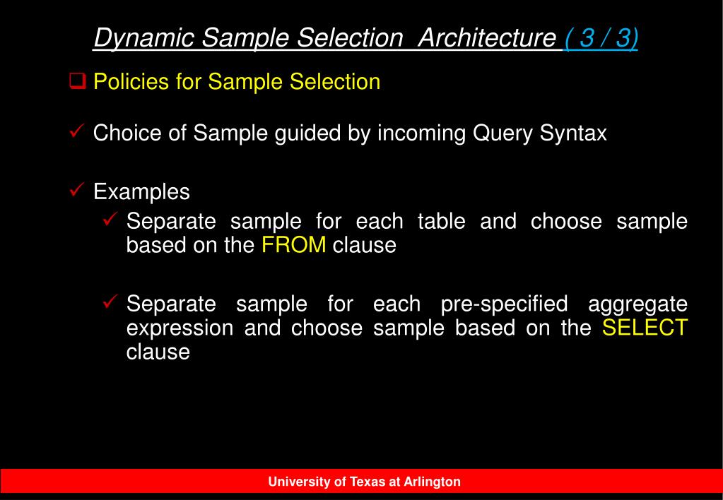 Dynamic Sample Selection Architecture ( 3 / 3) • Policies for Sample Selection • Choice of Sample guided by incoming Query Syntax • Examples • Separate sample for each table and choose sample based on the FROMclause • Separate sample for each pre-specified aggregate expression and choose sample based on the SELECTclause
