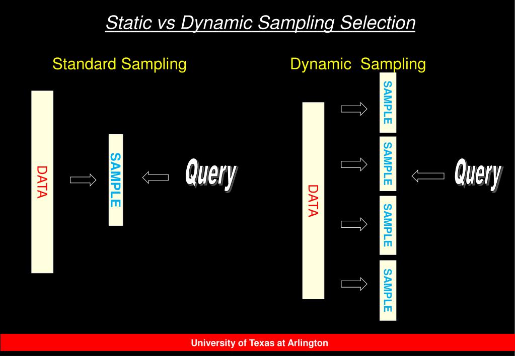 Dynamic Sampling SAMPLE DATA DATA SAMPLE SAMPLE Query Query SAMPLE SAMPLE Static vs Dynamic Sampling Selection StandardSampling