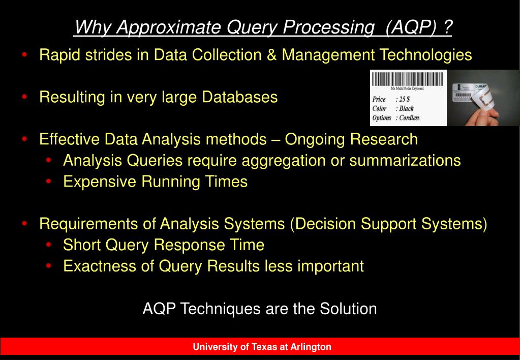 Why Approximate Query Processing (AQP) ? • Rapid strides in Data Collection & Management Technologies • Resulting in very large Databases • Effective Data Analysis methods – Ongoing Research • Analysis Queries require aggregation or summarizations • Expensive Running Times • Requirements of Analysis Systems (Decision Support Systems) • Short Query Response Time • Exactness of Query Results less important AQP Techniques are the Solution