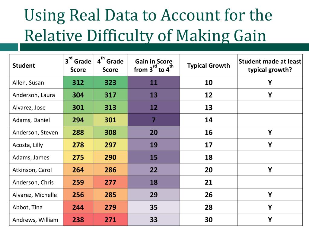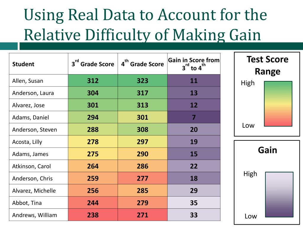 Using Real Data to Account for the Relative Difficulty of Making Gain Test Score Range High Low Gain High Low