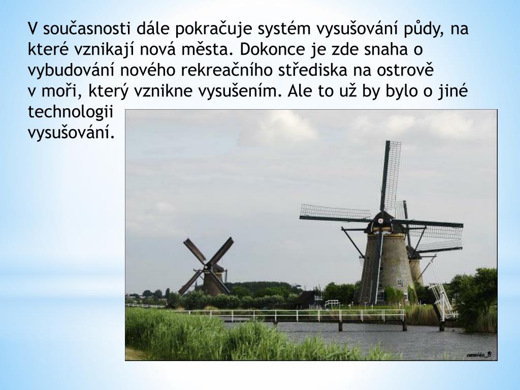 V současnosti dále pokračuje systém vysušování půdy, na které vznikají nová města. Dokonce je zde snaha o vybudování nového rekreačního střediska na ostrově v moři, který vznikne vysušením. Ale to už by bylo o jiné technologii vysušování.