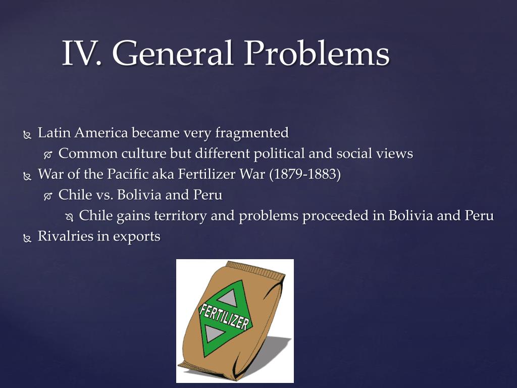 Latin America became very fragmented • Common culture but different political and social views • War of the Pacific aka Fertilizer War (1879-1883) • Chile vs. Bolivia and Peru • Chile gains territory and problems proceeded in Bolivia and Peru • Rivalries in exports IV. General Problems