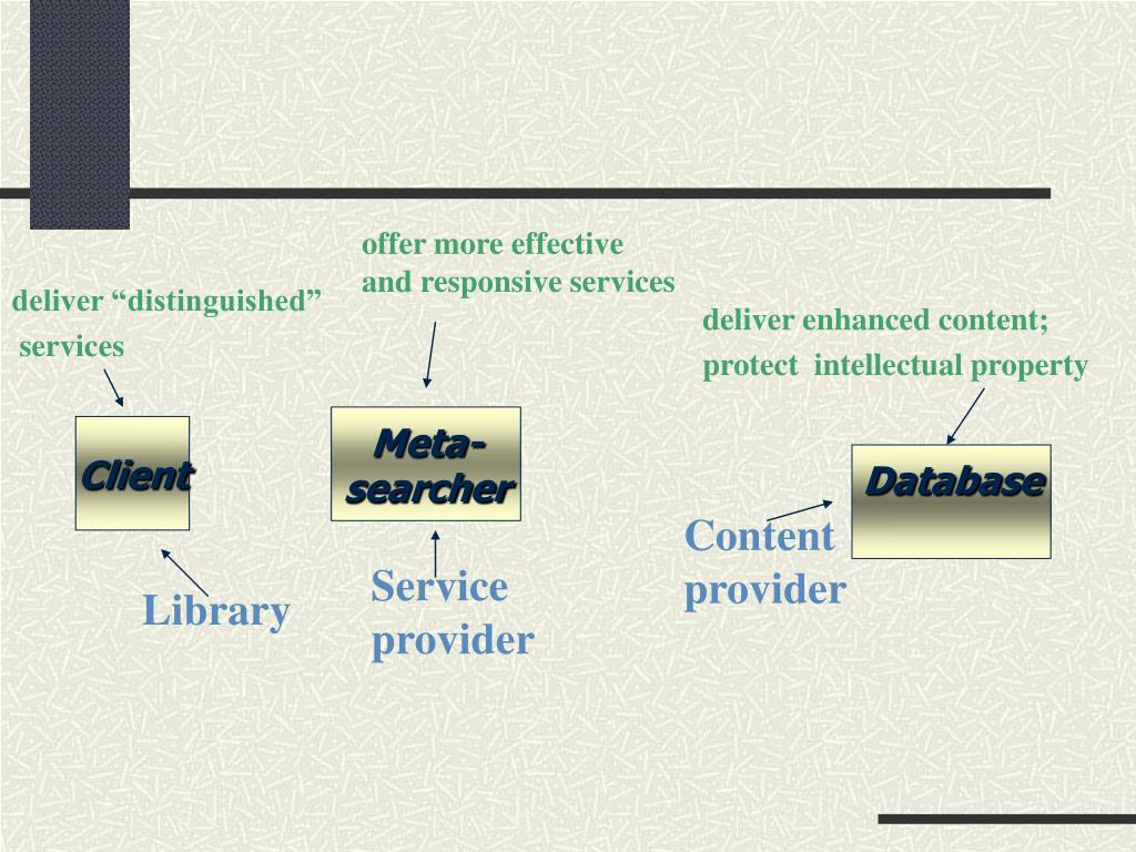offer more effective and responsive services deliver “distinguished” services deliver enhanced content; protect intellectual property Meta- searcher Client Database Contentprovider Service provider Library
