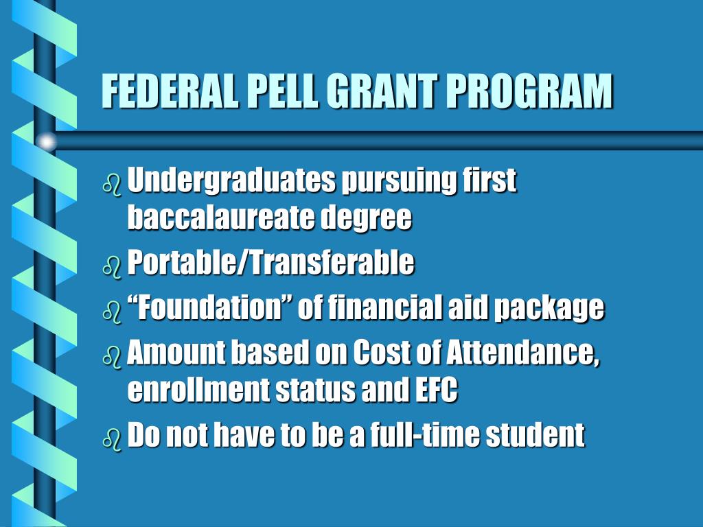 FEDERAL PELL GRANT PROGRAM • Undergraduates pursuing first baccalaureate degree • Portable/Transferable • “Foundation” of financial aid package • Amount based on Cost of Attendance, enrollment status and EFC • Do not have to be a full-time student