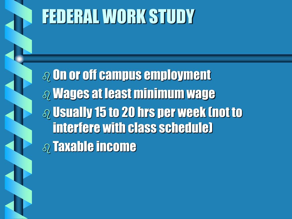 FEDERAL WORK STUDY • On or off campus employment • Wages at least minimum wage • Usually 15 to 20 hrs per week (not to interfere with class schedule) • Taxable income