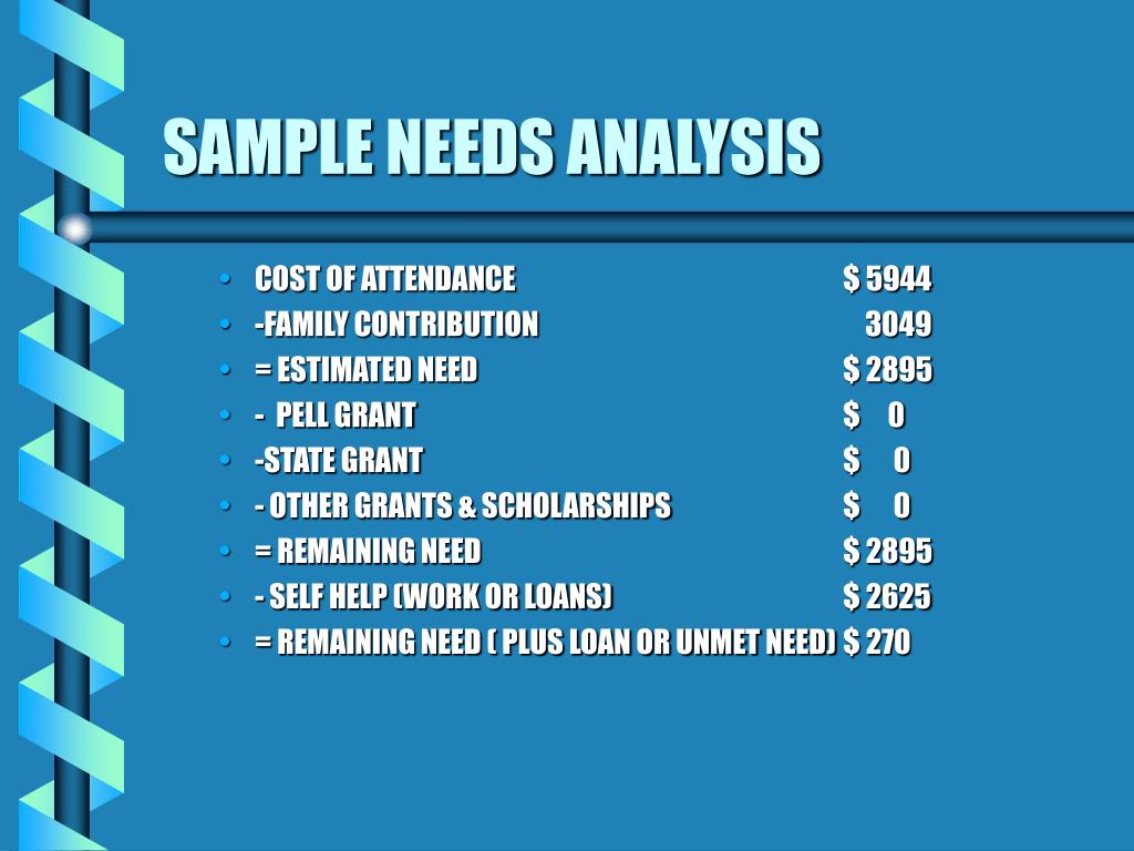 SAMPLE NEEDS ANALYSIS • COST OF ATTENDANCE $ 5944 • -FAMILY CONTRIBUTION 0 • = ESTIMATED NEED $5944 • - PELL GRANT $3000 • -STATE GRANT $ 334 • - OTHER GRANTS & SCHOLARSHIPS 0 • = REMAINING NEED $ 2610 • - SELF HELP (WORK OR LOANS) $2610 • = REMAINING NEED ( PLUS LOAN OR UNMET NEED)