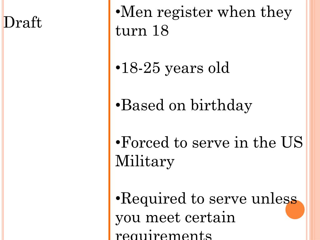 Men register when they turn 18 • 18-25 years old • Based on birthday • Forced to serve in the US Military • Required to serve unless you meet certain requirements Draft