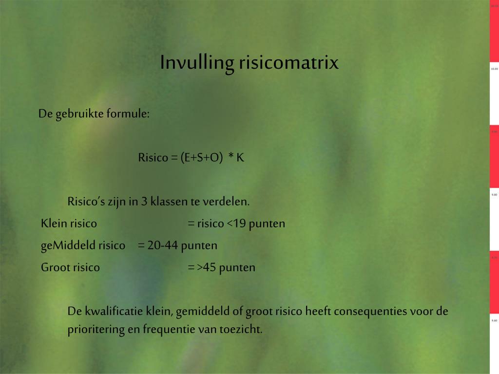 Invulling risicomatrix De gebruikte formule: Risico = (E+S+O) * K Risico’s zijn in 3 klassen te verdelen. Klein risico = risico <19 punten geMiddeld risico = 20-44 punten Groot risico = >45 punten De kwalificatie klein, gemiddeld of groot risico heeft consequenties voor de prioritering en frequentie van toezicht.