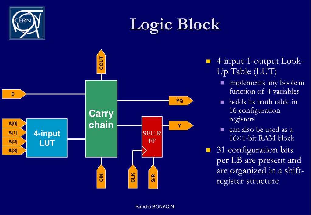 Typical FPGA architecture Array of 32×32 Logic Blocks (LBs) Configurable routing SRAM based Reprogrammable 256 I/Os Compatible with an existing commercial device Same design tools can be reused Synthesis, Place & Route Logicblock Logicblock Logicblock Logicblock Logicblock Logicblock Logicblock Logicblock Logicblock Radiation-tolerant FPGA Sandro BONACINI