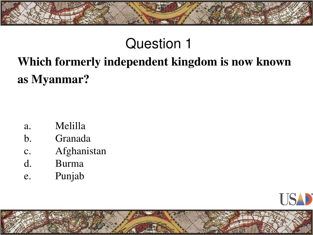 Question 1 Which formerly independent kingdom is now known as Myanmar? a. Melilla b. Granada c. Afghanistan d. Burma e. Punjab