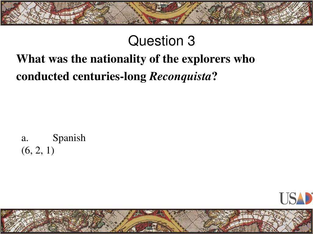 Question 3 What was the nationality of the explorers who conducted centuries-long Reconquista? a. Spanish (6, 2, 1)