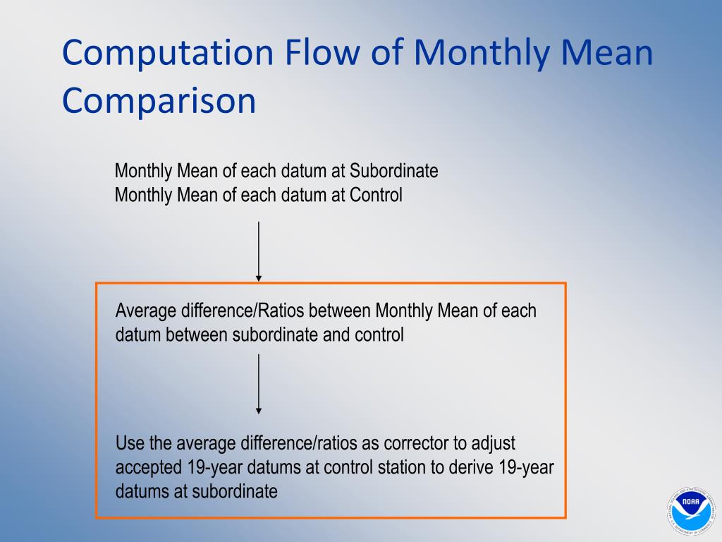 Computation Flow of Monthly Mean Comparison Monthly Mean of each datum at Subordinate Monthly Mean of each datum at Control Average difference/Ratios between Monthly Mean of each datum between subordinate and control Use the average difference/ratios as corrector to adjust accepted 19-year datums at control station to derive 19-year datums at subordinate