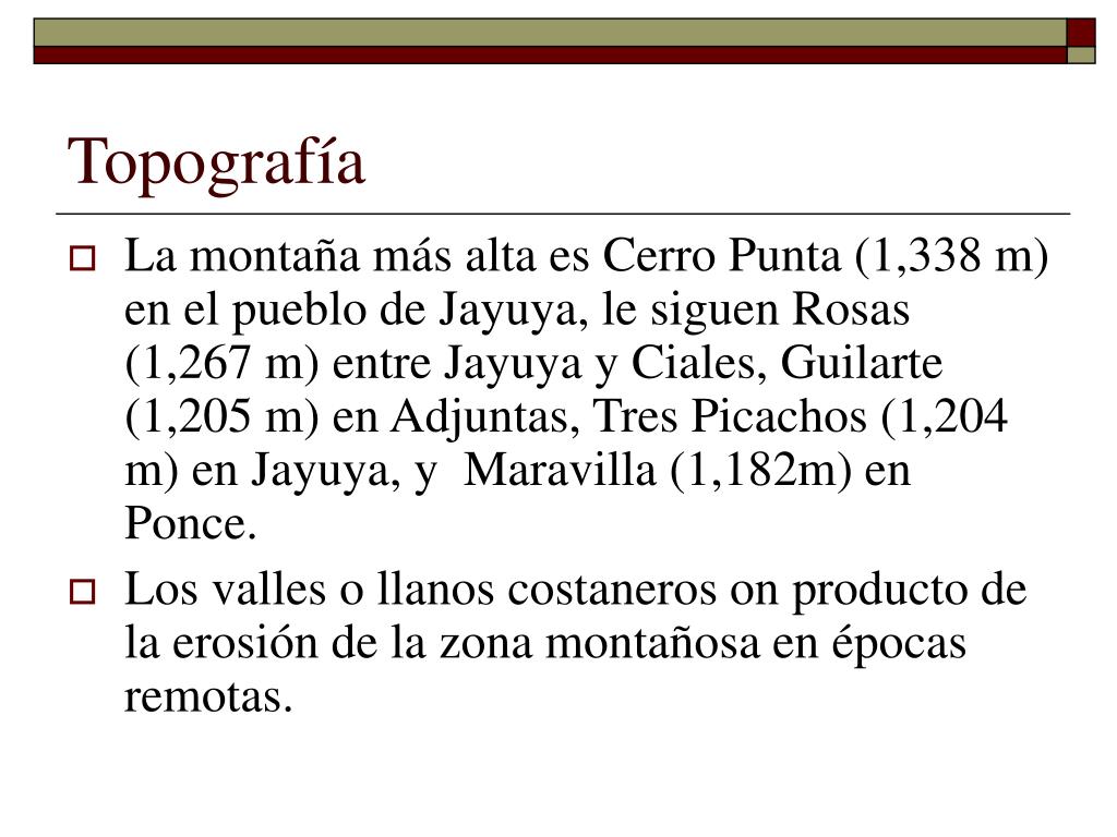 Topografía • La montaña más alta es Cerro Punta (1,338 m) en el pueblo de Jayuya, le siguen Rosas (1,267 m) entre Jayuya y Ciales, Guilarte (1,205 m) en Adjuntas, Tres Picachos (1,204 m) en Jayuya, y Maravilla (1,182m) en Ponce. • Los valles o llanos costaneros on producto de la erosión de la zona montañosa en épocas remotas.