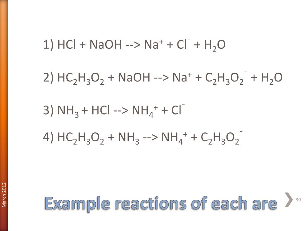1) HCl + NaOH --> Na+ + Cl¯ + H2O 2) HC2H3O2 + NaOH --> Na+ + C2H3O2¯ + H2O 3) NH3 + HCl --> NH4+ + Cl¯ 4) HC2H3O2 + NH3 --> NH4+ + C2H3O2¯ Example reactions of each are