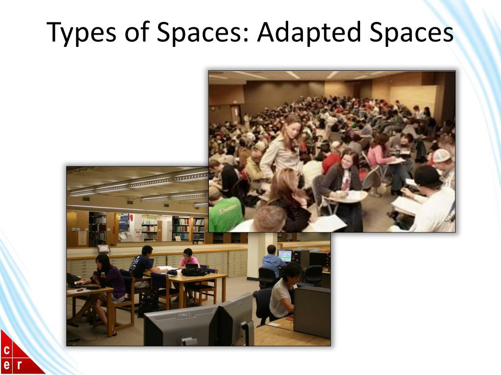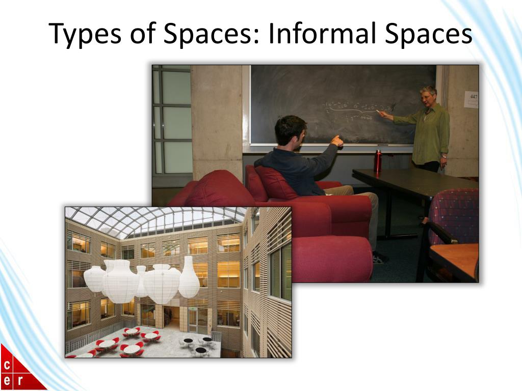 Types of Spaces • New buildings • New spaces within buildings • Adapted spaces • Informal learning spaces