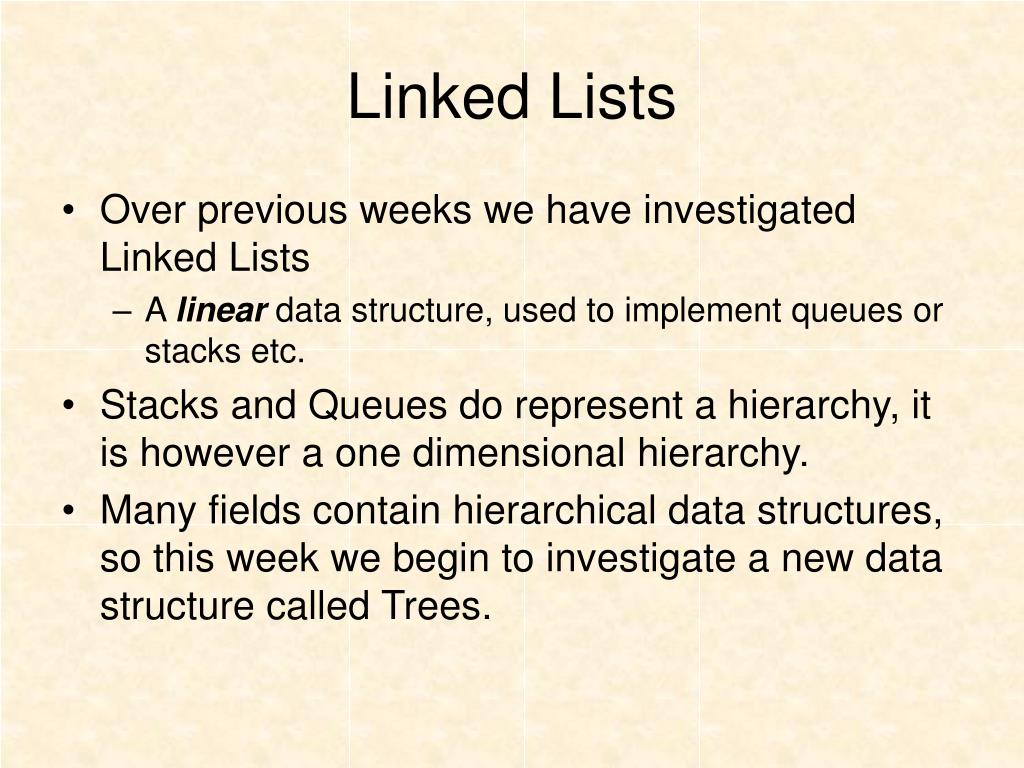 Linked Lists • Over previous weeks we have investigated Linked Lists • A linear data structure, used to implement queues or stacks etc. • Stacks and Queues do represent a hierarchy, it is however a one dimensional hierarchy. • Many fields contain hierarchical data structures, so this week we begin to investigate a new data structure called Trees.