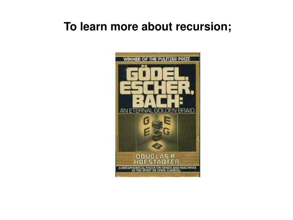Communications Studies and Personal Development. - Damian Gordon -. Recursion. 5! = 5 X 4 X 3 X 2 X 1 4! = 4 X 3 X 2 X 1 So, 5! = 5 X (4 X 3 X 2 X 1) 5! = 5 X 4! N! = N X (N - 1)! Factorial is be defined in terms of itself This is recursion. To learn more about recursion;.