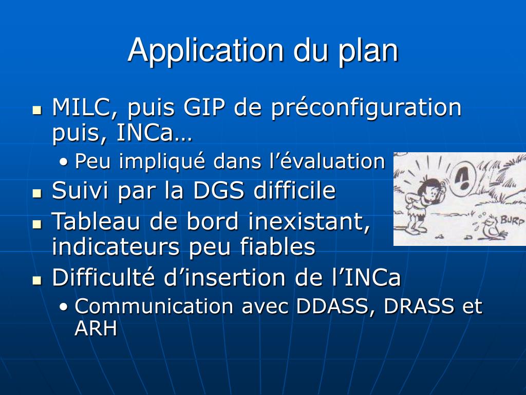 Application du plan • MILC, puis GIP de préconfiguration puis, INCa… • Peu impliqué dans l’évaluation • Suivi par la DGS difficile • Tableau de bord inexistant, indicateurs peu fiables • Difficulté d’insertion de l’INCa • Communication avec DDASS, DRASS et ARH