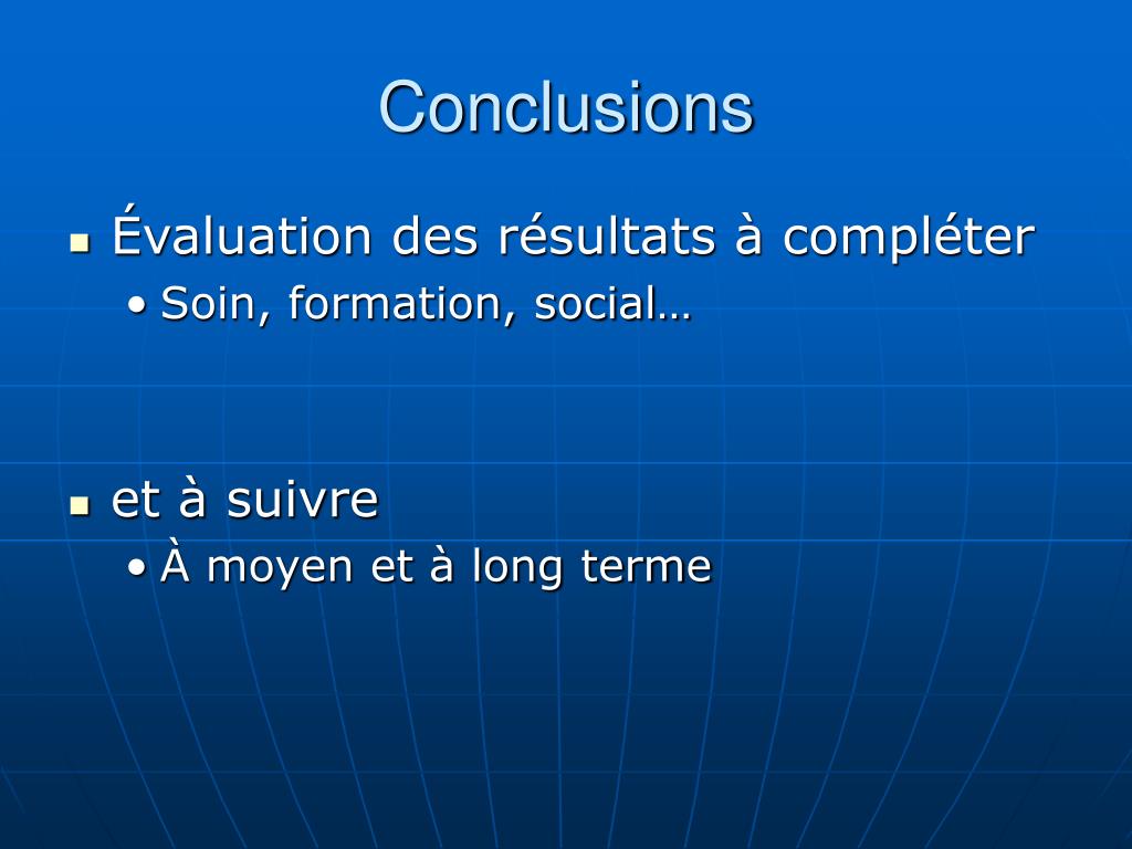 Conclusions • Évaluation des résultats à compléter • Soin, formation, social… • et à suivre • À moyen et à long terme
