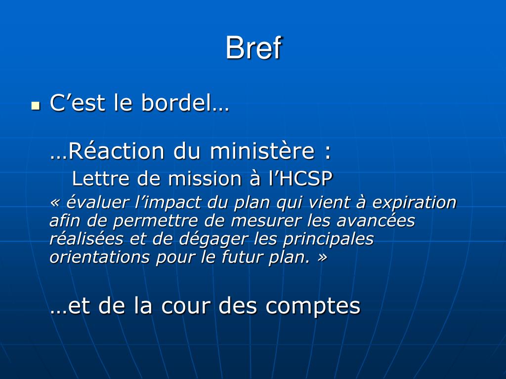 Bref • C’est le bordel… …Réaction du ministère : Lettre de mission à l’HCSP « évaluer l’impact du plan qui vient à expiration afin de permettre de mesurer les avancées réalisées et de dégager les principales orientations pour le futur plan. » …et de la cour des comptes